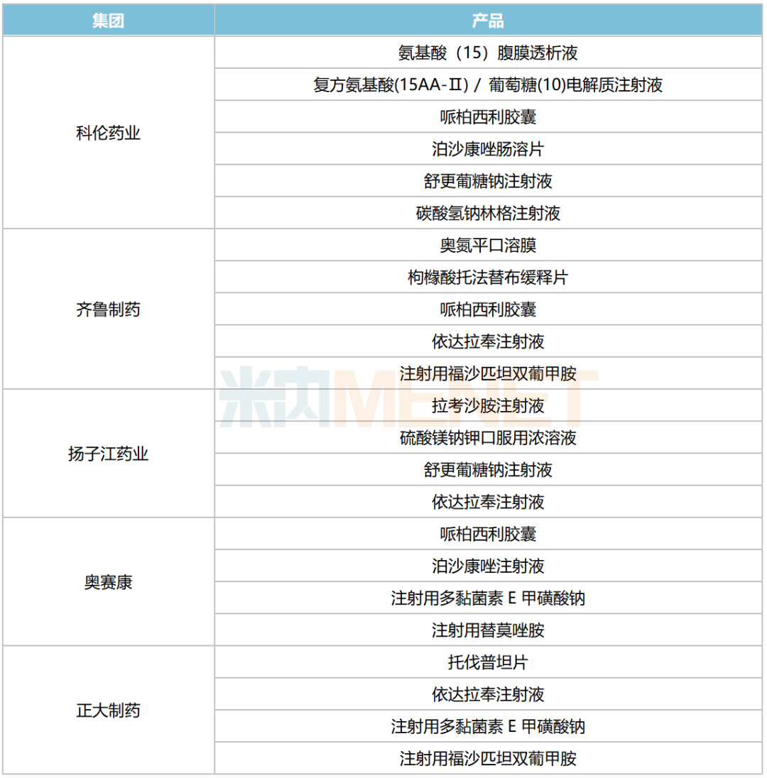 整體來(lái)看,20個(gè)新“入?!钡姆仟?dú)家產(chǎn)品若按集團(tuán)統(tǒng)計(jì),科倫藥業(yè)涉及6個(gè)產(chǎn)品,齊魯制藥涉及5個(gè)產(chǎn)品,揚(yáng)子江藥業(yè)、奧賽康、正大制藥均涉及4個(gè)產(chǎn)品。